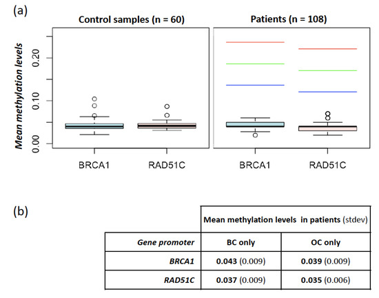 Methylation levels at BRCA1 and RAD51C promoters in controls and patients. (a) Mean methylation levels at BRCA1 and RAD51C promoters measured in 60 controls (left panel) and 108 patients (right panel). In the right panel, the red, green, and blue dashed lines indicate the thresholds used for the identification of hypermethylated cases obtained by adding the prefixed value of 0.15, 0.1, and 0.05, respectively, to the one-sided 95% bootstrap confidence interval of the controls’ mean; (b) mean methylation levels at BRCA1 and RAD51C promoters in samples stratified according to cancer localization (breast cancer (BC) only vs. ovarian cancer (OC) only).
