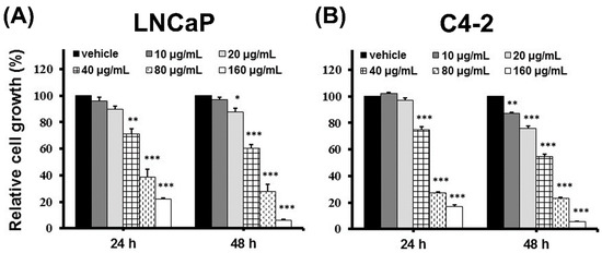 Davallia formosana (DF) ethanol extract (DFE) suppresses prostate cancer (PCa) cell growth. (A) LNCaP and (B) C4-2 cells were treated with vehicle or DFE (10, 20, 40, 80, and 160 µg/mL) for 24 and 48 h. PCa cell growth was determined by MTT analysis. The relative cell growth (%) was shown as 100 in vehicle-treated PCa cells at each time point and each cell line. Data represented as the mean ± SD of three independent experiments. * p < 0.05, ** p < 0.01, *** p < 0.001.