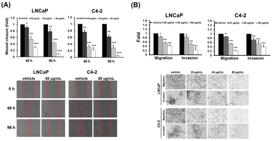 Next, the effects of DFE on the PCa migratory and invasive potentials, the hallmarks of progressive cancer cells, were investigated. A wound healing assay was first applied to evaluate the migratory ability of PCa cells affected by DFE. As shown in Figure 2A (top and bottom panels), DFE led to a significant inhibition of wound closure compared to a vehicle group in PCa cells after 48 and 96 h treatments. Subsequently, migration and invasion of PCa cells affected by DFE were examined using the transwell method. DFE significantly suppressed the capabilities of migration and invasion in both LNCaP and C4-2 cells in a dose-dependent manner (20, 40, and 80 µg/mL) (Figure 2B, top and bottom panels). Taken together, the data of the functional analyses indicate that DFE led to suppression of cell growth, migration, and invasion in PCa cells.