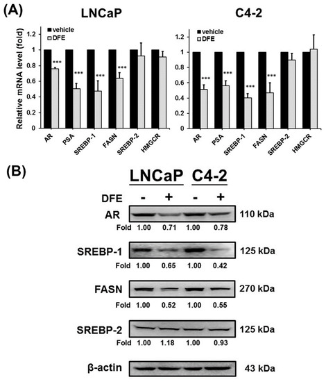 DFE inhibited sterol regulatory element-binding protein-1 (SREBP-1)/fatty acid synthase (FASN) and androgen receptor (AR)/prostate-specific antigen (PSA) expression in LNCaP and C4-2 cells. (A) DFE inhibited the messenger RNA (mRNA) expression of AR/PSA and SREBP-1/FASN, but did not significantly affect SREBP-2 and 3-hydroxy-3-methyl-glutaryl-coenzyme A reductase (HMGCR) mRNA expression in PCa cells. The relative mRNA level was defined as 1.0 (fold) in the vehicle-treated cells. Data were normalized by β-actin mRNA expression and shown as the mean ± SD of triplicate assays with three independent experiments. *** p < 0.001. (B) DFE reduced the protein amounts of AR, SREBP-1, and FASN in LNCaP and C4-2 cells. β-actin was used as a loading control. Data were normalized by β-actin protein expression. The relative fold was defined as 1.00 in the vehicle-treated LNCaP or C4-2 cells, respectively.