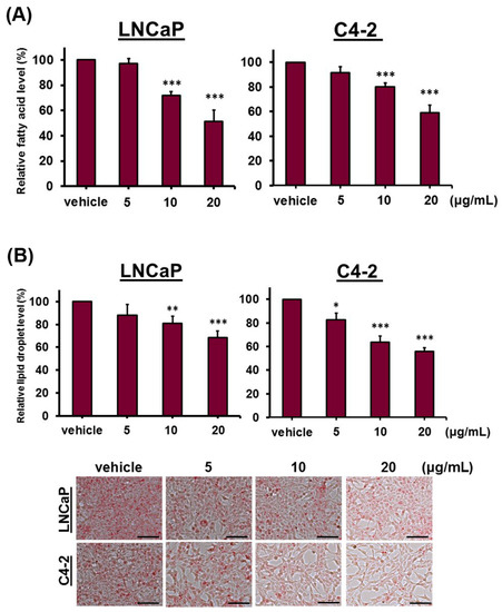 DFE reduced the expression of key factors, SREBP-1 and FASN, which regulated lipogenesis; we next performed staining assays and quantification analyses of lipogenesis to assess the levels of intracellular fatty acids and lipid droplets in PCa cells treated with DFE. As shown in Figure 4A, DFE affected the fatty acid levels in both LNCaP and C4-2 cells with a concentration-decreased pattern compared to the vehicle group. Additionally, DFE also significantly diminished the levels (Figure 4B, top panel) and staining (Figure 4B, bottom panel) of lipid droplets in LNCaP and C4-2 cells. The results of lipogenic experiments indicate that by inhibition of SREBP-1 and FASN expression, DFE decreased the fatty acid levels and lipid droplet accumulations in both LNCaP and C4-2 cells.