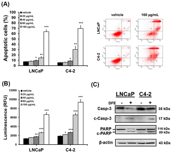 Several studies demonstrated that impairment of SREBP-1/FASN/lipogenesis and the AR axis leads to apoptosis in cancer cells [21,22,23,28]. Subsequently, we investigated if DFE led to cell death and induced the caspase-dependent apoptosis in PCa cells. DFE increased the numbers (%) of apoptotic PCa cells in a dose-dependent manner determined by Annexin V-Fluorescein isothiocyanate (FITC)/propidium iodide (PI) staining flow cytometry-based assay (Figure 5A). Significantly, apoptotic cells were 63.70% ± 3.58% (LNCaP) and 69.63% ± 5.35% (C4-2) treated by DFE (160 µg/mL, 24 h), respectively (Figure 5A). The vehicle-treated apoptotic PCa cells were only 7.47% ± 0.55% (LNCaP) and 5.64% ± 0.45% (C4-2) (Figure 5A). Furthermore, the catalytic activity of caspase-3, as well as the protein expression of caspase-3 and poly (ADP-ribose) polymerase (PARP), were determined to assess if caspase-dependent apoptosis was activated by DFE in PCa cells. DFE induced the enzymatic activity of caspase-3 in a concentration-dependent manner in LNCaP and C4-2 cells (Figure 5B). Besides, DFE treatment decreased the protein levels of both caspase-3 and PARP but induced the protein expression of cleaved (c)-caspase-3 (17 kDa) and c-PARP (89 kDa) in LNCaP and C4-2 cells assayed by Western blotting (Figure 5C). The results of the apoptotic study suggest that DFE treatment promoted cell death via the induction of caspase-dependent apoptosis in PCa cells.