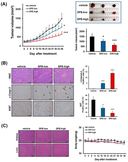 To evaluate the anti-PCa potential of DFE in vivo, we first established a subcutaneous xenograft mouse model of C4-2 tumors, castration-resistant PCa cells. Subsequently, the various doses of DFE (250 (low) and 500 (high) mg/kg body weight) or vehicle were given by oral administration daily in the C4-2 tumor-bearing mice, respectively. As shown in Figure 6A (left and right panels), the mice treated with DFE displayed a significant efficacy on volume reduction of C4-2 tumors in a concentration-dependent manner compared to the vehicle control group during 36-day observation. Administration with the DFE-high group significantly attenuated C4-2 tumor volumes from the 12th day onwards (p < 0.05) in comparison with the control group. Besides, the DFE-low group showed significant inhibition of the tumor volumes from the 21st day onwards (p < 0.05) in comparison with the control group. To determine the underlying molecular basis by which DFE inhibited the C4-2 tumor burdens in mice, immunohistochemical (IHC) staining of c-caspase-3 (a marker of apoptosis) and Ki67 (a marker of cell proliferation) in C4-2 tumor specimens collected from the DFE-treated and the vehicle control mice was performed. Significantly increased c-caspase-3 expression and decreased Ki67 expression in the DFE-treated C4-2 tumors compared to the vehicle group were detected (Figure 6B, left and right panels). The IHC results indicate that DFE reduced cell proliferation and induced caspase-dependent apoptosis in C4-2 tumors in vivo. Moreover, the histopathological features of the kidney and liver specimens were examined to evaluate the general cytotoxicity of DFE treatment in C4-2 xenograft mice. Microscopically, no substantial changes were observed in both kidney and liver tissues harvested from the DFE-low and DFE-high-treated mice in comparison with the vehicle-treated mice (Figure 6C, left panel). Besides, no apparent differences were found in the body weights among these three groups (Figure 6C, right panel). The results of histopathological features and body weights suggest that DFE treatment showed no apparent cytotoxicity in the mice bearing with C4-2 tumors. The in vivo data collectively demonstrated that DFE suppressed growth and induced apoptosis in subcutaneous C4-2 tumors without showing significant cytotoxicity in mice. It indicates that DFE would be able to be employed as a safe and attractive anti-PCa drug.