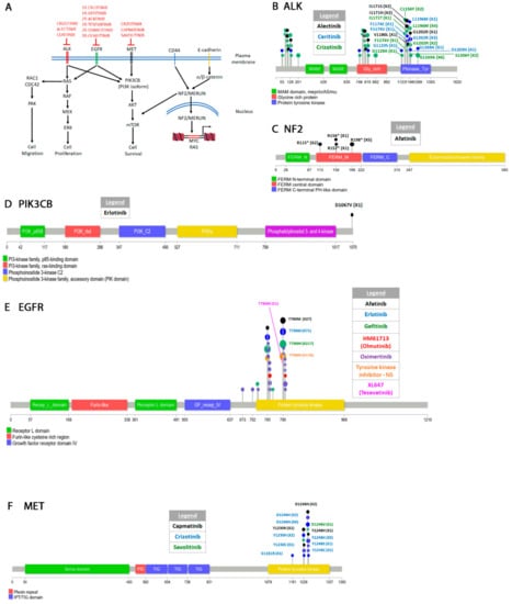 Signal transduction pathways in non-small cell lung cancers (NSCLC) and drug resistant mutations. (A) Some of the signaling pathways targeted by drugs that are discussed in this paper. Three receptor tyrosine kinases (ALK, EGFR, and MET) acquire resistant mutations to the drugs shown in red. For EGFR 1st, 2nd, and 3rd generation drugs are indicated as 1R, 2R, and 3R respectively. The CD44-cadherin-NF2/Merlin pathway that activates transcription of the MYC and RAS proto-oncogenes is also shown. Activating mutations in the NF2/merlin arise in response to drugs that target ALK, EGFR, and MET. (B–F) Diagrams showing the position of the mutations in several genes shown in (A). Note, that in order to not over-clutter the diagrams only some of the mutations are shown for certain genes. A comprehensive list is found in the supplementary material.