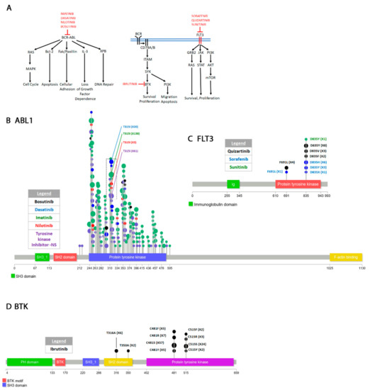 Pathways targeted in cancers of the hematopoietic and lymphoid tissue and drug resistant mutations. (A) The fused BCR-ABL protein signals through several pathways to activate cell cycle, apoptosis, adhesion, DNA repair and loss of growth factor dependence. The drugs that target the BCR-ABL fusion are shown. Some of these drugs also target the ABL1 wild type protein. Please see text for discussion. The pathways involving BTK and the FLT3 receptor tyrosine kinase are also shown because they are discussed in the text. (B) Mutations in the ABL1 gene cluster in the protein tyrosine domain. Only a few of the mutations are labeled to prevent clutter. Please see Supplementary Figure S1 for all mutations. (C,D) Resistant mutations in FLT3 and BTK.