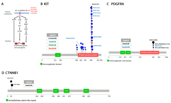 Imatinib, nilotininb and sunitinib are all used for treatment of GISTs. Imatinib is able to inhibit KIT [372] and PDGFR [373] receptors. KIT D816 mutations (D816A/E/G/H) also appear as secondary mutations in response to the drug (Figure 3B, Supplementary Table S3). The two other most reported KIT resistant mutation to imatinib are V654A and Y823D. Molecular modeling shows that these mutations decrease the affinity of the drug for KIT [374]. In PDGFRA, the D842V substitution occurs most often (Figure 3C, Supplementary Table S3) [375]. Structural analysis shows that the D842V is an activating mutation that increases PDGFRA affinity for ATP [376]. A melanoma patient treated with imatinib developed both a L576P KIT mutation and a CTNNB1 S33C mutation (Figure 3D) [377]. Modeling simulations show that the L576P KIT mutation which also appears in GIST [378] is an activating mutation [379]. CTNNB1 encodes beta-catenin which is part of the Wnt signaling pathway that has diverse functions including cell proliferation and migration [380,381]. The S33C mutation knocks out a phosphorylation site and appears to stabilize the protein [382,383].