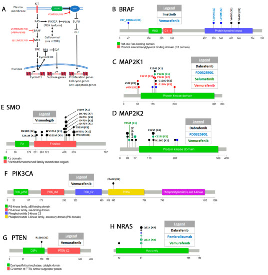 Melanomas are malignant melanocytic neoplasms. Although malignancies can occur in any tissue where melanocytes are found, skin melanomas are the most prevalent in sun exposed white people [395,396]. Skin melanomas are generally classified as chronically sun damaged (CSD) and non-chronically sun damaged (non-CSD) [397]. CSD melanomas are characterized by high mutation burden that leads to disruption of several pathways [396]. The serine/threonine kinase BRAFV600E mutation that disrupts the KIT-NRAS-BRAF-MEK-ERK-CDK4/6-RB pathway (Figure 4) is almost always present in both CSD and non-CSD melanomas [398]. The mutation also appears in NSCLC [399]. The CSD melanomas often have additional KIT, NRAS and NF1 mutations [400]. The BRAFV600E is a driver mutation in melanomas because it constitutively activates BRAF and the ERK pathway [401,402].