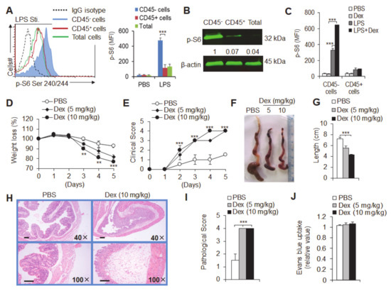 Dexamethasone (Dex) promotes experimental dextran sulfate sodium (DSS)-induced ulcerative colitis. (A,B) CD45+ cells, CD45- cells and total cells isolated from colon tissue, and p-S6 Ser240/244 were determined. A typical histogram of flow cytometry data and the mean fluorescence intensity (MFI) of p-S6 is shown (A). Western blot analysis and quantification show the expression of p-S6 Ser240/244. The expression levels of p-S6 Ser240/244 were normalized to the CD45- cell group. The fold changes between p-S6 and β-actin were calculated, and the highest expression (CD45- cells, in this case) was set as 1 (B). (C) Mean fluorescence intensity (MFI) of p-S6 Ser240/244 with flow cytometry in CD45+ and CD45- cells isolated from colon tissue and treated as indicated. (D–J) DSS-induced ulcerative colitis mice were intraperitoneally (i.p.)injected with different doses of dexamethasone (Dex; 5 or 10 mg/kg). Weight loss (D) and disease clinical scores (E) were significantly increased in Dex-treated mice compared to those in phosphate buffer saline (PBS)-treated control mice. Dex-treated mice developed severe ulcerative colitis as shown by colonic shortening (F,G), severe pathological colitis (H) and the pathological score (I). (J) Basal colonic epithelial permeability was equal in PBS- and Dex-treated mice as measured by Evans Blue uptake. Representative results are based on one of three or four independent experiments performed with similar results. The data are presented as the mean ± SD, (n = 4–6 mice per group). Statistical significance was measured by one-way ANOVA. **P< 0.01 and ***P< 0.001, compared with the indicated groups.