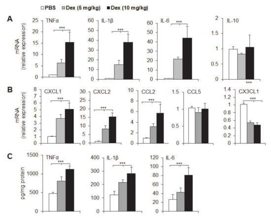 3.4. Dex Treatment Potentiated Mucosal Expression of Pro-Inflammatory Cytokines and Chemokines