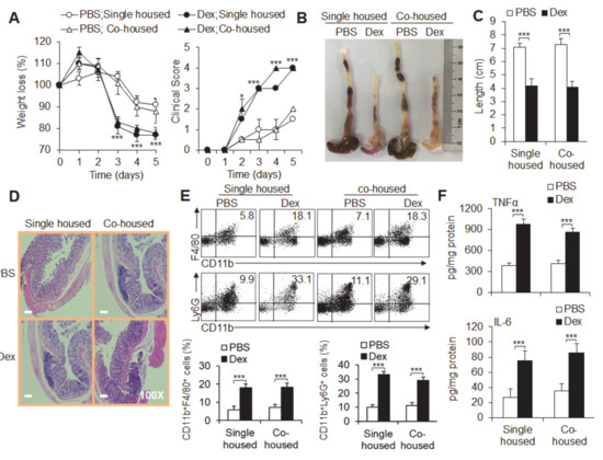 To confirm the effect of the microbiota on acute ulcerative colitis, we established acute experimental colitis by cohousing vehicle (PBS)-treated and Dex-treated colitis mice and comparing them with single-housed colitis mice. The mice were treated with vehicle or Dex for at least 6 weeks before and throughout these experiments. Although Dex-treatment still significantly exacerbated colitis, as evidenced by significantly lower body weight, a reduced DAI score and severe destructive macroscopic and histological pathological alterations as described above, the symptoms, pathological changes, inflammatory immune cell infiltration and inflammatory cytokine TNFα and IL-6 production in colitis showed no significant differences between cohoused and single-housed colitis mice (Figure 4a–f). These results suggest that reciprocal exchanges of different mouse microbiota did not play a critical role in Dex-induced severe acute experimental ulcerative colitis.