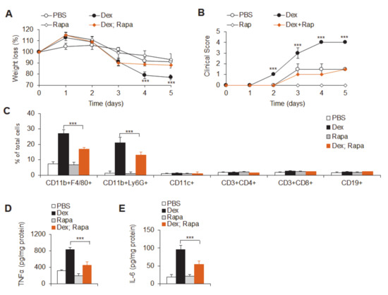 Rapamycin treatment alleviated Dex-potentiated DSS-induced ulcerative colitis. Dextran sulfate sodium (DSS)-induced mice were intraperitoneally (i.p.) injected with different doses of dexamethasone (Dex) (5 or 10 mg kg) and rapamycin (Rapa; 3 mg/kg). Weight loss (A) and disease clinical scores (B) are summarized. (C) The flow cytometry staining of the indicated cells in the colons of acute colitis mice is shown, and the data are summarized. (D,E) The indicated mucosal cytokine concentrations were measured by ELISA and are expressed as pg/mg total protein. Representative results are based on one of three or four independent experiments performed with similar results. The data are presented as the mean ± SD (n = 3–5 mice per group). Statistical significance was measured by one-way ANOVA. ***P < 0.001, compared with the indicated groups.