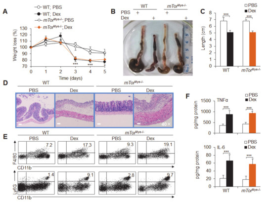 Then, we investigated the effects of mTOR in myeloid cells and epithelial cells with conditional knockout mice that were subjected to Dex-treated acute colitis. We crossed mTorfl/fl and Lyz-Cre mice to conditionally delete mTor gene expression in myeloid cells, including macrophages and neutrophils; these mice were called mTorMye−/− thereafter (Figure S5). Although Dex treatment caused significantly severe colitis, mTOR signaling deficiency in myeloid cells did not significantly alter the course of DSS-induced colitis, including weight loss, changes in colon length, pathological damage, inflammatory immune cell infiltration and the production of the inflammatory cytokines TNFα and IL-6 (Figure 6a–f). These results suggest that myeloid mTOR is not involved in Dex-induced severe colitis.