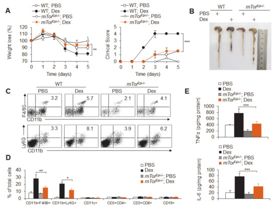 Furthermore, we crossed mTorfl/fl and Vil-Cre mice to conditionally delete mTor gene expression in intestinal epithelial cells; these were called mTorEpi−/− mice. Interestingly, mTOR deficiency in epithelial cells partially, but significantly, recovered the severe course of colitis caused by Dex, including weight loss, changes in clinical score, changes in colon length, pathological damage, inflammatory cell infiltration and pro-inflammatory cytokine production (Figure 7a–e and Figure S6a,b). Thus, intestinal epithelial cell mTOR is critical for Dex-induced severe ulcerative colitis.