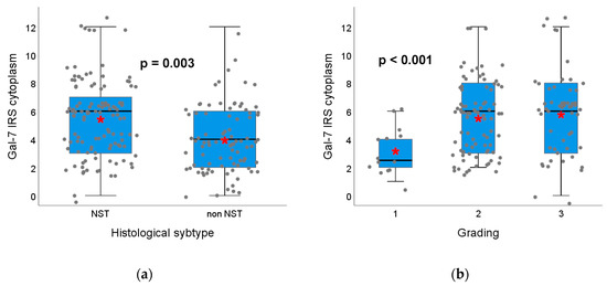 The Gal-7 expression correlated negatively with the histopathological subtype. Kruskal–Wallis test and boxplots analysis showed that Gal-7 expression in the cytoplasm was significantly higher in no special type (NST) tumors compared to non-NST tumors (median IRS 6 in NST vs. 4 in non-NST, p < 0.001) (Figure 1a). Similarly, Gal-7 expression in the nucleus was significantly higher in NST tumors (p = 0.042). The Gal-8 expression did not differ concerning the histological subtype.
