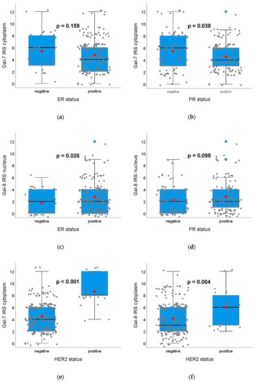 Both Gal-7 and Gal-8 staining in the cytoplasm correlated significantly with the HER2-status (Spearman analysis in Tables S1 and S2). HER2-positive breast cancer samples showed a distinctly higher Gal-7 expression in the cytoplasm compared to HER2-negative tumor sections (median IRS in HER2+: 8 vs. in HER2-: 4, p < 0.001, Figure 3e). Gal-8 expression in the cytoplasm in HER2-positive tissue sections was significantly higher than in HER2-negative samples (median IRS in HER2+: 6 vs. in HER2-: 3, p = 0.004, Figure 3f). Gal-7 and Gal-8 staining in the nucleus were not significantly associated with HER2-status (Figure S1).