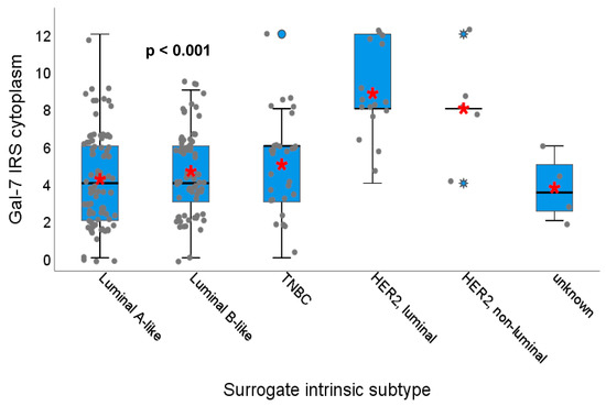 The Gal-7 expression in the cytoplasm differed significantly regarding the different surrogate intrinsic subtypes (p < 0.001) (Figure 4): HER2-positive tumors (both luminal B-like and non-luminal) clearly showed the highest Gal-7 expression in the cytoplasm compared to all other subtypes (Luminal A-like and B-like and TNBC). The distribution of Gal-8 staining, neither in the cytoplasm (Figure S2) nor in the nucleus, and Gal-7 expression in the nucleus in the different surrogate intrinsic subtypes showed no significant differences.