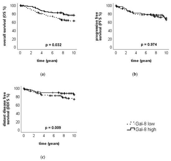 High Gal-8 expression in the cytoplasm (IRS > 5) was associated with an improved outcome: Tumors with a high Gal-8 expression in the cytoplasm showed a significantly improved OS compared to tumors with low Gal-8 expression in the cytoplasm (p = 0.032, median OS in both subgroups NR) (Figure 6a). No significance in the outcome regarding PFS (p = 0.974, median PFS in both subgroups NS, Figure 6b) and DDFS (p = 0.138, median DDFS in both subgroups NR, Figure 6c) was found.