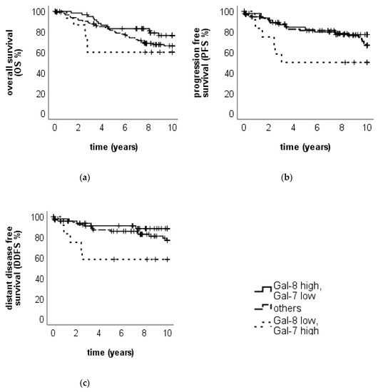 Median overall survival (OS), progression-free survival (PFS) and distant disease-free survival (DDFS) in the whole cohort was not reached (NR). The prognostic relevance of Gal-7 and -8 was analyzed concerning PFS, DDFS and OS and tumors were categorized in “high” and “low” expressing tumors using ROC-curve analysis.