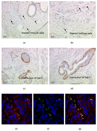 Gal-7 had an interesting expression pattern in the tumor tissue, with staining on only the outer layer of cancer cells and expression in the immune cells next to the tumor cells as well (Figure 8a–d). Gal-7 staining in the immune cells was not included as part of the IRS-scoring for the cancer specimen in the analyses described above. The immune cell staining of Gal-7 correlated significantly with the tumor grading: in tissue sections defined as grade 1 no stained immune cell infiltration was observed, whereas in grade 2 and 3, stained immune cells were detected (p = 0.008, Figure S10a). Gal-7-expressing immune cells were furthermore found significantly more often in NST compared to non-NST tumors (p = 0.001, Figure S10b) and in tumors with lymph node metastasis (p = 0.038, Figure S10c). A double immunofluorescence staining with Gal-7 and CD68 (a macrophage marker) showed that the Gal-7 stained immune cells were macrophages (Figure 8e–g).