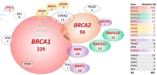 - Ramus, S.J.; Song, H.; Dicks, E.; Tyrer, J.P.; Rosenthal, A.N.; Intermaggio, M.P.; Fraser, L.; Gentry-Maharaj, A.; Hayward, J.; Philpott, S.; et al. Germline Mutations in the BRIP1, BARD1, PALB2, and NBN Genes in Women With Ovarian Cancer. J. Natl. Cancer Inst. 2015, 107. [Google Scholar] [CrossRef] [PubMed]