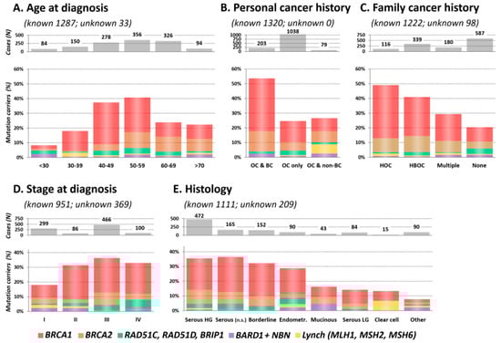 Proportion of mutation carriers in clinicopathological subgroups, including (A) Age at OC diagnosis; (B) Personal cancer history; (C) Family cancer history; (D) Stage at diagnosis; (E) Histology in 1320 OC patients.