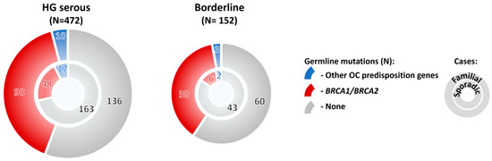 Genetic predisposition for OC is unusually high and is reported in up to 25% of cases [4,5,6]. The most frequent germline mutations affect the BRCA1 and BRCA2 genes, conferring 24% and 8.4% OC lifetime risks, respectively [7]. The BRCA1 and BRCA2 mutation carriers frequently but not exclusively develop HG serous OC [8]. Carriers of mutations in these major OC predisposition genes have also very high risk of breast cancer (BC) development. A high OC risk has also been associated with germline mutations in RAD51C, RAD51D, Lynch syndrome genes, and STK11; a moderate OC risk with BRIP1 [9,10,11,12,13]. Risks associated with germline mutations in genes with anticipated BC and/or OC predisposition (incl. ATM, BARD1, CDH1, CHEK2, NBN, PALB2, PTEN, and TP53) and in other candidate genes remain to be determined [14,15,16,17]. The identification of presymptomatic women at high risk who can benefit from risk-reducing salpingo-oophorectomy (RRSO) is of critical importance, as demonstrated by the reduced OC mortality in BRCA1 and BRCA2 mutation carriers undergoing preventive surgery [18].