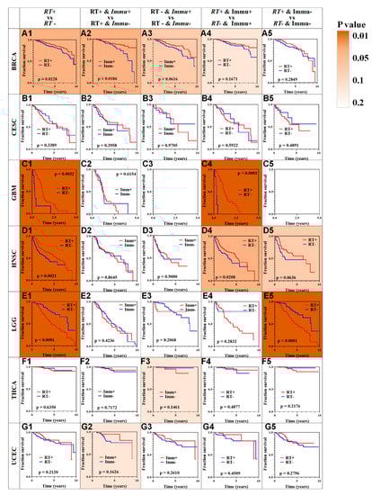 Survival analysis across seven cancer types. Each row represents a type of cancer and each column represents a different grouping. For each type of cancer (A–G), we performed five different survival analysis (numbers 1–5, refer to Figure 1D). A Kaplan–Meier Plotter was used to test for survival prediction capacity. A combination of letters (A–G) and numbers (1–5) were used to number all the results. Correspondingly, the patients with an immune score greater than zero were defined as positive (+), and those with a score below zero were defined as negative (-). Additionally, patients with or without RT treatment were defined as positive (+) or negative (-), respectively. A total of seven types of cancer were analyzed: BRCA (A1–A5), CESC (B1–B5), GBM (C1–C5), HNSC (D1–D5), LGG (E1–E5), THCA (F1–F5), UCEC (G1–G5). For C3 and C5, the data was insufficient for analysis. The fill color was related to the p value, the darker the more statistically significant.