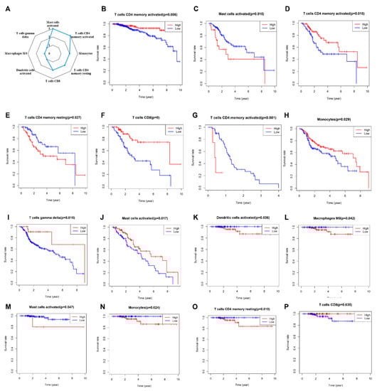 Prognostic value of 22 tumors infiltrating immune cells across seven cancer types. The radar chart (A) gives an overview of the cell types with prognostic value. According to the Kaplan–Meier analysis, only cells that displayed significant correlation RT outcomes were shown in this figure (B–P). Red lines indicate high immune infiltration of a certain cell, and blue lines indicate low immune infiltration. Each picture corresponds to a different type of cancer BRCA (B), CESC (C–F), GBM (G), HNSC (H,I), LGG (J), THCA (K–P).