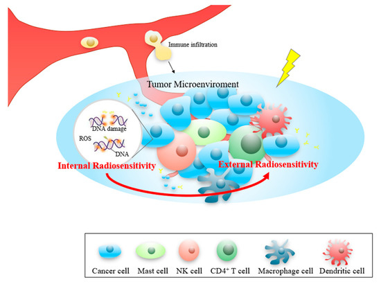 In the current era of precision medicine, high-throughput technologies have provided an opportunity to approach the development of radiosensitivity biomarkers from a different perspective. For example, based on a 10-gene signature, Eschrich et al. developed the radiosensitivity index (RSI), which is directly proportional to tumor radioresistance [7]. Further, Speers et al. created a human breast cancer (BRCA)-specific radiosensitivity signature (RSS) with biological relevance and validated this signature for the prediction of local recurrence [8]. Finally, Gene Ontology (GO) analyses were employed to define key molecular biomarkers governing response to radiation in rectal cancer [9]. However, all these studies were based on the intrinsic radiation response of tumor cells and the effects of the TME on this response were ignored [10,11].