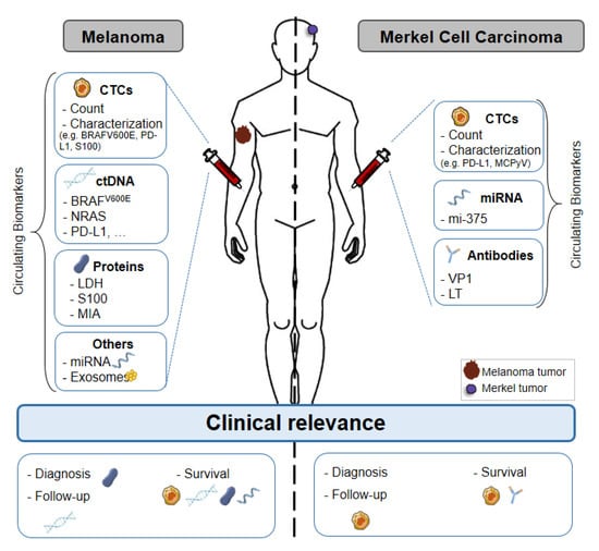 This review discusses the most recent data on liquid biopsy in patients with melanoma, the most common skin cancer with high prevalence in US and European populations [1], or Merkel Cell Carcinoma (MCC), a skin tumor with a disease-associated mortality rate even higher than that of melanoma [2]. Due to their high mortality rate, new technologies are needed to improve the patient outcome. Particularly, specific biomarkers are required to facilitate their diagnosis and management. For a long time, cancer study was based on the analysis of specimens from the primary tumor or its metastases and on imaging data. The current limitations of tumor tissue biopsies and clinical imaging for cancer diagnosis and molecular profiling have led to the development of liquid biopsy. Indeed, tumor biopsy is an invasive procedure, and tumor tissue (especially in patients with cutaneous melanoma) is not always available. Therefore, liquid biopsy, a blood-based analysis of tumor-specific biomarkers, has been introduced as a new diagnostic approach that relies on circulating tumor cells (CTCs) and on circulating tumor-derived factors, such as cell-free tumor DNA (ctDNA), microRNAs (miRNA) and exosomes. The ultimate goal of liquid biopsy is to use the information gathered from such cells and factors to predict early cancer progression and to longitudinally monitor the treatment response, for a personalized medicine of patients with cancer. In melanoma, liquid biopsy has been already used to study many biomarkers (e.g., CTCs, ctDNA and exosomes), and its clinical pertinence is currently investigated in various clinical trials. For MCC, studies are in the early days and very few articles have been published. Moreover, no clinical trial is assessing liquid biopsy in MCC. In this review, we describe the circulating biomarkers and discuss the technical challenges and the clinical relevance of liquid biopsy for these two skin malignancies.