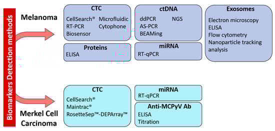 Technologies for the detection of circulating biomarkers currently used in melanoma and Merkel cell carcinoma. Abbreviations: CTC: Circulating Tumor Cell, ctDNA: Circulating tumor DNA, miRNA: microRNA, RT-PCR: reverse-transcriptase polymerase chain reaction, RT-qPCR: reverse-transcriptase quantitative PCR, ELISA: enzyme-linked immunosorbent assay, ddPCR: droplet digital PCR, AS-PCR: Allele Specific PCR, BEAMing: Bead Emulsion Amplification Magnetic, NGS: Next-Generation Sequencing.