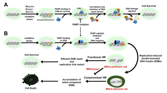 - Helleday, T. The underlying mechanism for the PARP and BRCA synthetic lethality: Clearing up the misunderstandings. Mol. Oncol. 2011, 5, 387–393. [Google Scholar] [CrossRef]