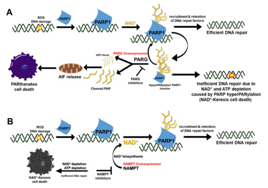 - David, K.K.; Andrabi, S.A.; Dawson, T.M.; Dawson, V.L. Parthanatos, a messenger of death. Front. Biosci. (Landmark Ed) 2009, 14, 1116–1128. [Google Scholar] [CrossRef]