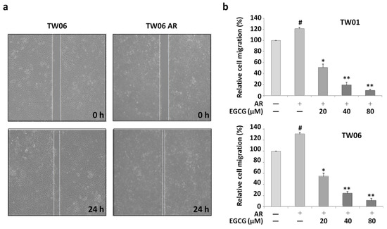 The migratory ability of AR cells was evidently higher than that of the parental adherent TW06 cell lines as shown in Figure 1a. However, after the cells were treated with different concentrations of EGCG (20, 40, and 80 μM) for 24 h, the transwell migration assay demonstrated that the enhanced migration of the AR cells was significantly inhibited (Figure 1b). These results indicate that although the NPC AR cells expressed aggressive behavior, their invasiveness was suppressed by the inhibitory effect of EGCG.