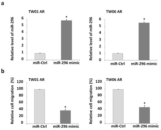 To determine whether the upregulation of miR-296 induced by EGCG exerted inhibitory effects on the cell migration of NPC AR cells, we supplemented the cells with an exogenous source of miR-296 by transfecting an miR-296 mimic in the TW01 and TW06 cells (Figure 3a). As expected, transfection of the miR-296 mimic significantly suppressed the migration of the NPC AR cells (Figure 3b). These results suggest that the increase in miR-296 expression caused by EGCG inhibited the invasiveness of the NPC AR cells.