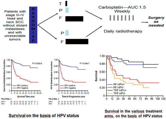A subgroup analysis carried out in the TAX 324 study, as well as the results of the ECOG 2399 trial, clearly demonstrated that HPV-related HSNCC responded better to induction TPF (docetaxel, cisplatin and 5-FU) followed by chemoradiation, when compared with the p16-negative counterpart [60,61], (Figure 3).