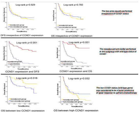 Moreover, Feng et al. [62] demonstrated that wild-type (WT) CCND1 (the gene encoding for CyclinD1) HNSCC displayed a significantly better response to induction chemotherapy compared with tumors showing CCND1 gene amplification (Figure 4). HPV-related HNSCCs often show the wild-type status for CCND1 concomitantly with wild-type status of p16. The authors concluded that the WT status for CCND1 could predict good response to induction chemotherapy and, consequently, we can assume that the presence of HPV-related carcinogenesis may represent a predictive factor of good response to induction chemotherapy, followed by chemoradiation (Figure 4).