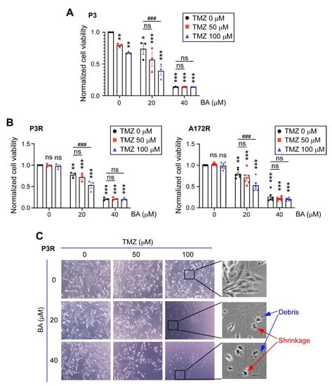 BA enhances TMZ antitumor effects in malignant GBM cells. (A) TMZ-sensitive P3, (B) TMZ-resistant P3R/A172R, and TMZ-resistant P5R GBM cells were treated with TMZ and/or BA at indicated concentrations for 2 days. (A,B) Cell viability of P3, P3R, and A172R cells determined by MTT assay. Data presented as means ± standard deviations (t-Test: * p < 0.05, ** p < 0.01, and *** p < 0.005 vs. nontreatment control; ### p < 0.005 vs. TMZ-alone group; ns: not significant). (C) Representative images of P3R cells (original magnifications ×100 [left panels] and ×400 [right panels]).