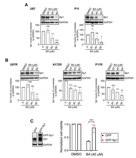 BA reduces Sp1 levels in GBM cells. (A,B) Cells treated with different concentrations of BA for 2 days. After treatment, Sp1 levels were determined by Western blotting. (C) Green fluorescent protein (GFP)- or GFP-Sp1-overexpressing U87MG cells treated with BA for 2 days. Cell viability determined by MTT assay. Data presented as means ± standard deviations (t-Test: * p < 0.05, ** p < 0.01, and *** p < 0.005; ns: not significant). For more details on Western blot, please view Supplementary Materials.
