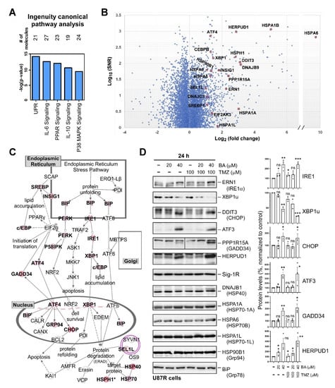 BA treatment alters expression of endoplasmic-reticulum (ER)-stress-related genes: (A) 1341 genes showing fold changes of greater than or equal to 2, and p values of less than or equal to 0.05 between BA and DMSO treatment used as input for canonical pathway analysis using IPA software. (B) Data for all genes plotted as log2 fold changes versus log10 of signal-to-noise ratio. Genes selected as significantly different and involved in unfolded-protein-response (UPR) signaling highlighted as red dots. (C) UPR pathway generated by IPA software. Colored molecules represent genes affected under BA treatment. Red molecules indicate upregulated genes. (D) U87MG cells collected 1 day after treatment with BA and/or TMZ at different concentrations. Cellular lysates were then analyzed by Western blotting with indicated antibodies. (Right panel) Protein levels of IRE1, XBP1u, CHOP, ATF3, GADD34, and HERPUD1 normalized to tubulin. Data presented as means ± standard deviations (t-Test: * p < 0.05, ** p < 0.01, and *** p < 0.005; ns: not significant). For more details of Western blot, please view Supplementary Materials.