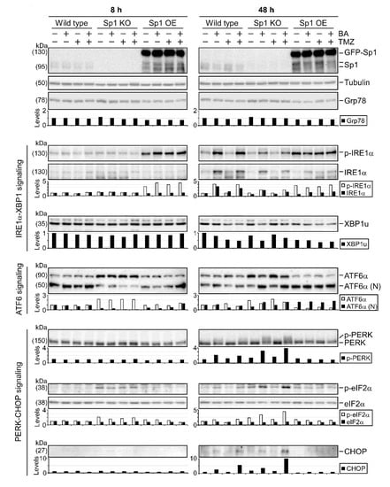 The PERK, IRE1α, and ATF6α signaling pathways relevant to UPR act as ER stress sensors by binding to ER chaperone Grp78, and remain inactive under normal conditions [21]. However, when unfolded proteins are accumulated in the ER, Grp78 preferentially binds to the unfolded proteins, leading to the release of PERK, IRE1α, and ATF6α. Subsequently, PERK and IRE1α undergo dimerization and autophosphorylation to initiate their downstream signaling pathways. ATF6α without Grp78 binding results in its translocation to the Golgi, where ATF6α is cleaved by proteases to become an active transcription factor. Here, we found that the phosphorylation and protein content of IRE1α, the cleaved/active form of ATF6α, and activation of the PERK/eIF2α/CHOP axis were increased after 2 days, but not 8 h, of treatment with BA, regardless of the presence or absence of TMZ (Figure 5).