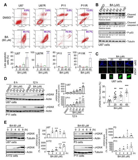 2.6. BA Triggers Apoptosis and DNA Damage in TMZ-Sensitive and -Resistant GBM Cells