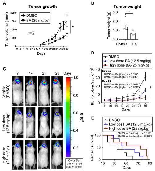 BA enhances therapeutic efficacy and long-term survival in GBM xenograft model mice. (A,B) TMZ-resistant U87MG cells implanted subcutaneously in NOD/SCID mice. On Day 4 after transplantation, mice were randomly grouped and treated with DMSO or BA for 4 weeks. (A) Tumor volume (length × width2 × 3.14/6) was measured three times a week. After treatment, mice were sacrificed. (B) Tumor weights. (C–E) Established orthotopic GBM xenograft animal model from luciferase + GFP dual-labeled U87MG cells (2.5 × 105 cells/mouse). Mice were treated with DMSO or BA at different doses three times a week. (C,D) Tumor growth monitored using in vivo image system (IVIS) twice a week. (E) Survival plotted using Kaplan–Meier curves. (A,B,D) Data presented as means ± standard deviations (t-Test: * p < 0.05).