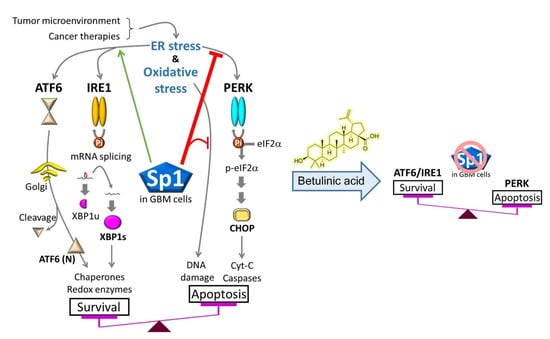 Sp1 protects malignant GBM cells against cancer therapies by altering ER/oxidative-stress responses, particularly inhibition of protein kinase RNA-like endoplasmic reticulum kinase (PERK)/eIF2α/ C/EBP-homologous protein (CHOP) activation. However, BA also reduces Sp1 expression, thereby promoting apoptotic cell death in GBM.