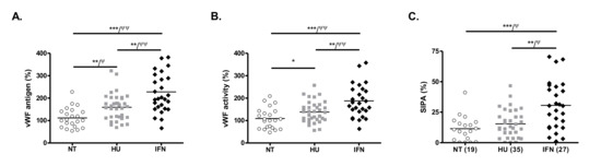 Von Willebrand factor antigen (A), von Willebrand factor activity (B), and platelet aggregation induced by high shear at 4000 s−1 (SIPA, C) in NT, HU-, and IFN-treated patients. Post-hoc pairwise comparisons of parameters were performed using Mann–Whitney test (* p < 0.05, ** p < 0.01, *** p < 0.001) and logistic regression analysis adjusted on age, sex, and disease type (ET or PV) (Ψ p < 0.05, ΨΨ p < 0.01).