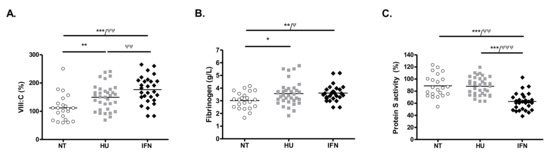 Levels of VIII:C (A) fibrinogen (B) and protein S activity (C) in NT, HU- and IFN-treated patients. Post-hoc pairwise comparisons of parameters were performed using the Mann–Whitney test (* p < 0.05, ** p < 0.01, *** p < 0.001) and logistic regression analysis adjusted for age, sex, and disease type (ET or PV) (Ψ p < 0.05, ΨΨ p < 0.01, ΨΨΨ p < 0.001).