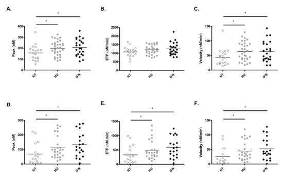 Thrombin generation in the plasma of NT, HU- and IFN-treated patients in the absence (A–C) and in the presence (D–F) of thrombomodulin. Peak of thrombin (A,D), ETP (B,E), and velocity (C,F). Post-hoc pairwise comparisons of parameters were performed using the Mann–Whitney test. * p < 0.05.