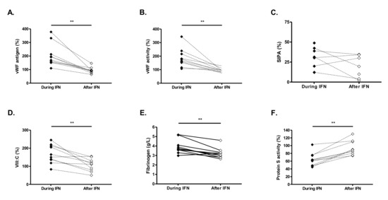 von Willebrand factor antigen (A), von Willebrand factor activity (B), platelet aggregation induced by high shear at 4000s−1 (SIPA, C), VIII:C (D) fibrinogen (E) and protein S activity (F) during IFN treatment and after IFN discontinuation in 10 patients. Comparison between the 2 groups was performed using Wilcoxon matched pairs test. ** p < 0.01.