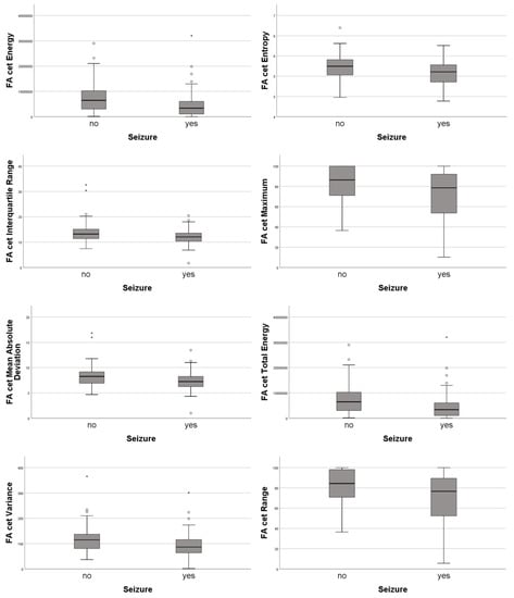 Histogram analyses of fractional anisotropy (FA) in the contrast enhancing tumor part significantly differed between patients with and without preoperative seizures. The following features showed significant differences: Energy (adj. p = 0.017), Entropy (adj. p = 0.043), Interquartile Range (adj. p = 0.013), Maximum (adj. p = 0.043), Mean Absolute Deviation (adj. p = 0.017), Range (adj. p = 0.025), Total Energy (adj. p = 0.017), Variance (adj. p = 0.039) (Figure 3). All features were significantly smaller in patients presenting with seizures.