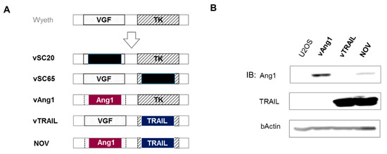 Cancer is a disease characterized by uncontrolled cellular growth associated with abnormal vessel formation. In the past, many researchers have developed drugs to decrease the formation of blood vessels with the aim of killing tumors by blocking their supply of oxygen and nutrients. In contrast, the strategy that we employed in the present study was to design a virus expressing Ang1, which is involved in normal vessel formation, to improve drug delivery and normal tissue reconstruction during the oncolytic process. Direct cancer killing is induced by oncolytic VV itself. In this strategy, the tumor microenvironment may become normal, and the Ang1/Tie2 pathway is critical to this phenomenon [27,28,29]. To improve the pan-cancer selectivity of the virus, VV was genetically engineered to express TRAIL, which can induce cell death selectively in many cancer cells but does not exhibit cytotoxicity in normal cells [24,25]. Therefore, NOV was generated by replacing both the VGF and TK regions with Ang1 and TRAIL. We disrupted VGF and/or TK in VV Wyeth strain for the selective infection of tumor cells [16,26]. Ang1 and TRAIL were then inserted into the disrupted VGF and TK regions, respectively (Figure 1A). vSC20 is VGF deleted VV, and vSC65 is TK deleted VV. vAng1 and vTRAIL are recombinant VVs that are comparable to NOV. vAng1 was generated by replacing VGF with Ang1, and vTRAIL was generated by replacing TK with TRAIL. Ang1 and TRAIL expression was confirmed in each virus construct by Western blot analysis using U2-OS (Figure 1B, Figure S1). It was expected that NOV would exhibit enhanced tumor selectivity and the ability to modulate the tumor microenvironment.